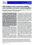 [en] While many tissues fold in vivo in a highly reproducible and robust way, epithelial folds remain difficult to reproduce in vitro, so that the effects and underlying mechanisms of local curvature on the epithelial tissue remains unclear. Here, we photoreticulated polyacrylamide hydrogels though an optical photomask to create corrugated hydrogels with isotropic wavy patterns, allowed us to show that concave and convex curvatures affect cellular and nuclear shape. By culturing MDCK epithelial cells at confluency on corrugated hydrogels, we showed that the substrate curvature leads to thicker epithelial zones in the valleys and thinner ones on the crest, as well as corresponding density, which can be generically explained by a simple 2D vertex model, leading us to hypothesize that curvature sensing could arise from resulting density/thickness changes. Additionally, positive and negative local curvatures lead to significant modulations of the nuclear morphology and positioning, which can also be well- explained by an extension of vertex models taking into account membrane-nucleus interactions, where thickness/density modulation generically translate into the corresponding changes in nuclear aspect ratio and position, as seen in the data. Consequently, we find that the spatial distribution of Yes associated proteins (YAP), the main transcriptional effector of the Hippo signaling pathway, is modulated in folded epithelial tissues according to the resulting thickness modulation, an effect that disappears at high cell density. Finally, we showed that these deformations are also associated with changes of A-type and B-type lamin expression, significant chromatin condensation and to lower cell proliferation rate. These findings show that active cell mechanics and nuclear mechanoadaptation are key players of the mechanistic regulation of epithelial monolayers to substrate curvature, with potential application for a number of in vivo situations.