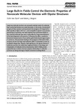 [en] Large area molecular junctions are nanoscale materials made of a molecular layer sandwiched between two metal electrodes. In this study, a fundamental property of these systems is demonstrated: the emergence of a large built-in field, typically as high as 109 V m−1, and susceptible to appear in any junction possessing an asymmetry. This field originates from permanent dipoles in the contacted molecular layer and is responsible for a large renormalization of the band alignment in the junction. To illustrate this effect, a predictive theoretical characterization of two realistic gold-thiolate-based organic layers is carried out. The parameters leading to the emergence of the built-in field are given and the very large renormalization effect is interpreted in terms of an applied voltage drop. Despite a high significance, this generic feature of molecular junctions has widely been neglected hitherto in the design and interpretation of molecular device characteristics. Built-in fields provide a powerful way to achieve structure–property relationships in molecular junctions, by taking advantage of dipolar nanometric building blocks.
