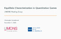 ![]() | Grandmont, C. (03 November 2025). Equilibria Characterization in Quantitative Games [Paper presentation]. Reading Group (Internal Seminar), Mons, Belgium. |